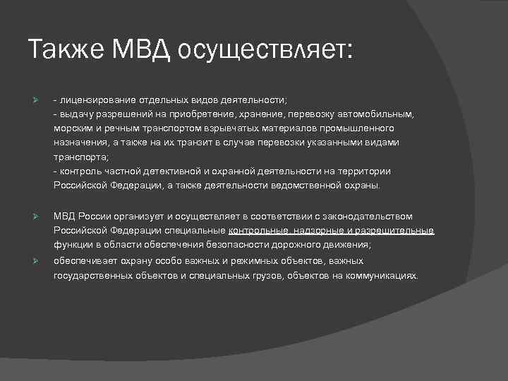 Также МВД осуществляет: Ø - лицензирование отдельных видов деятельности; - выдачу разрешений на приобретение, хранение, перевозку автомобильным, морским и речным транспортом взрывчатых материалов промышленного назначения, а также на их транзит в случае перевозки указанными видами транспорта; - контроль частной детективной и охранной деятельности на территории Российской Федерации, а также деятельности ведомственной охраны. Ø МВД России организует и осуществляет в соответствии с законодательством Российской Федерации специальные контрольные, надзорные и разрешительные функции в области обеспечения безопасности дорожного движения; Ø обеспечивает охрану особо важных и режимных объектов, важных государственных объектов и специальных грузов, объектов на коммуникациях.