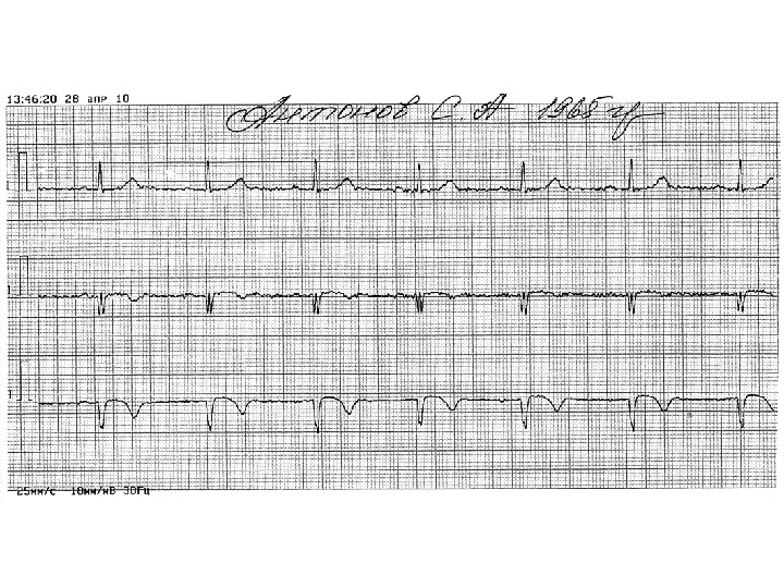 Инфаркт миокарда Синдром поражения миокарда СИМПТОМЫ: 1. Глухость тонов, ритм галопа. 2. Бради- и тахикардия. 3. Аритмии. 4. Гипотония, «обезглавленная» артериальная гипертония (снижение только систолического АД, а диастолическое остается высоким). 5. Изменения на ЭКГ.