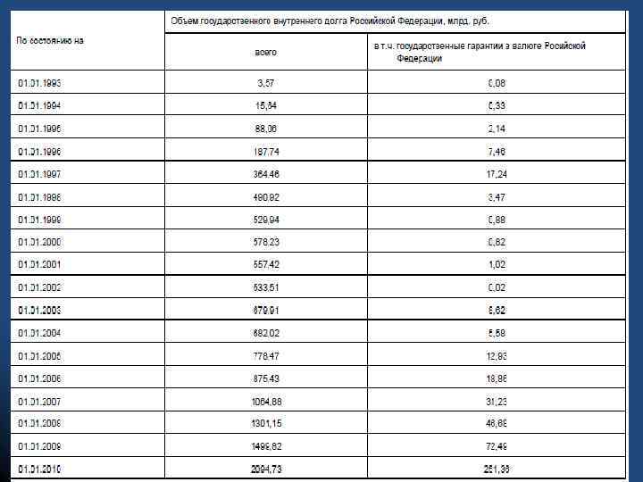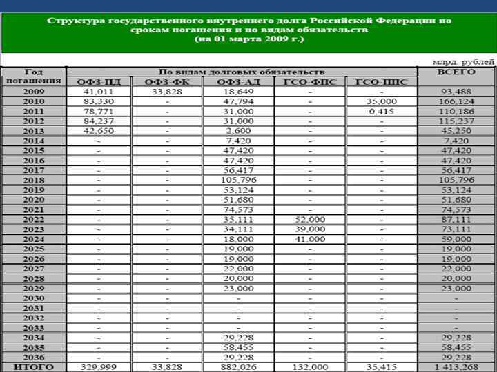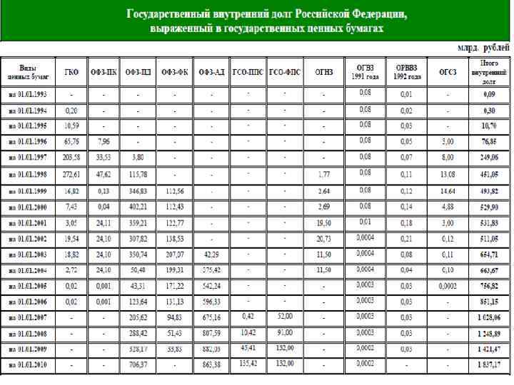 ВНУТРЕННИЙ ГОСУДАРСТВЕННЫЙ ДОЛГ l l l l l Казначейские обязательства; Задолженность по агропромышленному комплексу, переоформленная в вексель Министерства финансов Российской Федерации; Государственные краткосрочные облигации (ГКО) ; Государственные гарантии; Задолженность по финансированию затрат на формирование мобилизационного резерва; Облигации федеральных займов с переменным купонным доходом (ОФЗ ПК); Государственный сберегательный заем; Государственный внутренний целевой заем Российской Федерации для погашения товарных обязательств; Облигации федеральных займов с постоянным купонным доходом (ОФЗ ПД); Облигации федерального займа с фиксированным купонным доходом (ОФЗ ФК); Кредитные соглашения и договоры, заключенные от имени Российской Федерации; Государственные ценные бумаги субъектов Российской Федерации; Задолженность третьих лиц, переоформленная в государственный долг субъекта Российской Федерации; Муниципальные ценные бумаги; Государственные федеральные облигации (ГФО) ; Государственный внутренний долг Российской Федерации, принятый от бывшего Союза ССР; Государственные ценные бумаги, обеспеченные золотом;