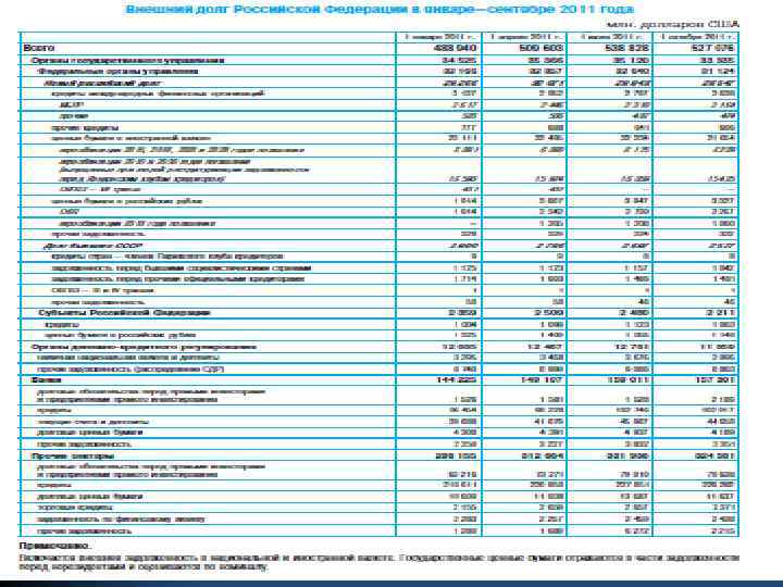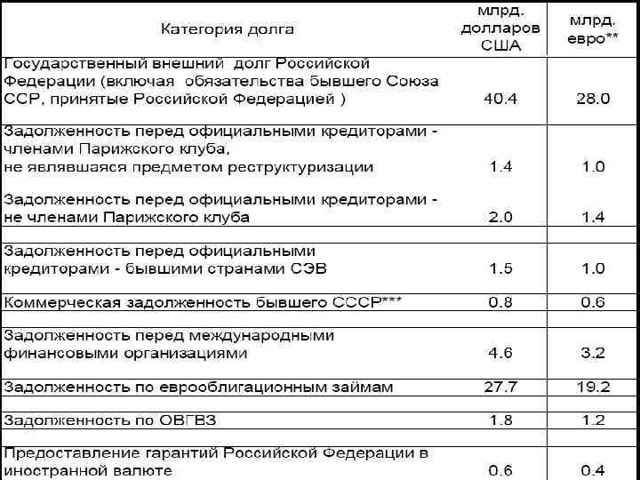 На 01. 08. 14 г. Категория долга эквивалент млн. евро** млн. долларов США Государственный внешний долг Российской Федерации (включая обязательства бывшего Союза ССР, принятые Российской Федерацией ) Задолженность перед официальными кредиторами - членами Парижского клуба, не являвшаяся предметом реструктуризации Задолженность перед официальными кредиторами - не членами Парижского клуба Задолженность перед официальными кредиторами - бывшими странами СЭВ Коммерческая задолженность бывшего СССР*** Задолженность перед международными финансовыми организациями Задолженность по внешним облигационным займам внешний облигационный заем с погашением в 2015 году 54 604, 6 40 731, 4 107, 9 925, 0 909, 7 22, 1 1 317, 8 40 006, 2 2 000, 0 80, 5 690, 0 678, 6 16, 4 983, 0 29 842, 0 1 491, 9