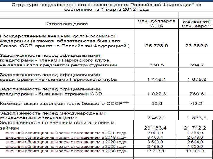 ВНЕШНИЙ ГОСУДАРСТВЕННЫЙ ДОЛГ Существует в форме: • Задолженности перед МВФ; • кредитов международных финансовых организаций; • кредитов МБРР; • нового российского долга: еврооблигации, размещённые по открытой подписке, а также выпущенные при реструктуризации: ГКО, задолженности перед Лондонским клубом кредиторов; • кредитов стран членов Парижского клуба; • долга бывшего СССР; • наличных национальных валют и депозитов; • долговых ценных бумаг и задолженностей по финансовому лизингу; • долговых обязательств перед прямыми инвесторами и т. д. • займов международных организаций; • кредитов и займов российских банков; • кредитов и займов российских предприятий; • валютных облигации внутреннего займа;
