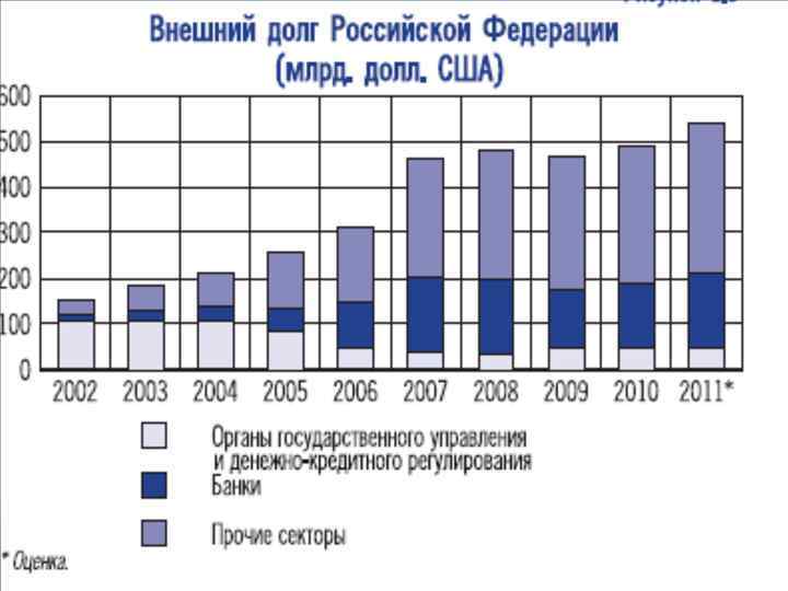 Задолженность по кредитам иностранных коммерческих банков и фирм • • обязательства перед Лондонским клубом кредиторов (досрочно погашено) Коммерческая задолженность: коммерческие кредиты (контракты с рассрочкой платежа, краткосрочные и среднесрочные коммерческие кредиты, подтвержденные траттами и векселями, тратты и векселя с платежом по предъявлении), аккредитивы (отзывные и безотзывные, включая аккредитивы с рассрочкой платежа) и инкассо.
