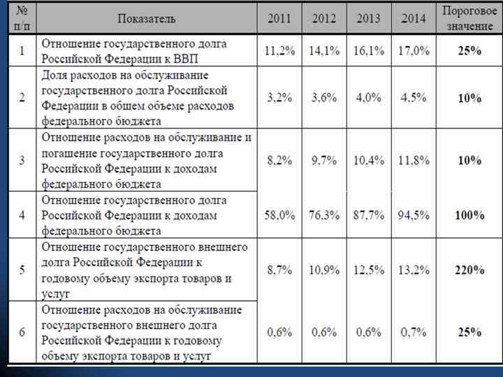 «Анализ государственного долга РФ в период 1992 -2015 гг. » l l l l 1. Динамика государственного внутреннего долга Российской Федерации в период 1992 …* гг. (млрд. руб. ). На 01. 2. Динамика государственного внешнего долга Российской Федерации в период 1992 …* гг. (млрд. долл. США). 3. Оценка долгового бремени РФ по методике МВФ и ВБ. За последние 3 года. 2014, 2013, 2012 4. Динамика отношения государственного долга РФ к ВВП (%). 5. Структура государственного внутреннего долга РФ по состоянию на … (актуальная дата) (млрд. руб. и %. ). 6. Структура государственного внешнего долга РФ по состоянию на … (актуальная дата) (млрд. долл. США и %). 7. долговая нагрузка ведущих стран мира в %от ВВП по состоянию на 2014 год (данные МВФ) 8. структура внешнего долга РФ(по данным ЦБ РФ)