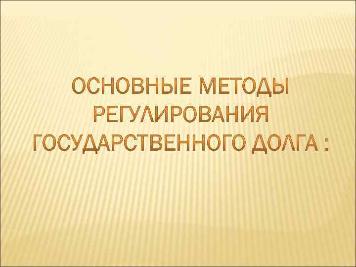 1)Рефинансирование погашение старой государственной задолженности, путем выпуска новых займов 2)Конверсия - изменение доходности займов 3)Консолидация 4) Унификация - когда дальнейшее развитие операции новых займов становится неэффективным. 5)Отсрочка погашения займа – проводится в тех случаях, когда дальнейшее развитие операций новых займов становится неэффективным. 6)Аннулирование государственного долга – это мера, в результате которой государство отказывается от обязанностей по выпущенным займам.