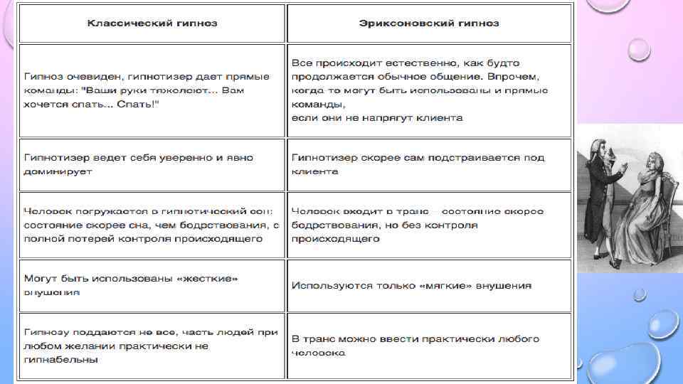 • ГИПНОТЕРАПИЯ КАК ЛЕЧЕБНЫЙ МЕТОД СТАЛА ПОПУЛЯРНА БЛАГОДАРЯ ПРАКТИКЕ ЗНАМЕНИТЫХ ВРАЧЕЙ М. ЭРИКСОНА И Д. ЭЛМАНА. • В 1958 Г. АМЕРИКАНСКИЕ МЕДИЦИНСКАЯ И ПСИХОЛОГИЧЕСКАЯ АССОЦИАЦИИ ПРИЗНАЛИ ИСЦЕЛЕНИЕ ЗАБОЛЕВАНИЙ С ПОМОЩЬЮ ГИПНОЗА КАК ПОЛНОЦЕННУЮ МЕДИЦИНСКУЮ ПРОЦЕДУРУ. С ЭТОГО МОМЕНТА УСПЕШНУЮ ТЕХНОЛОГИЮ СТАЛИ ПРИМЕНЯТЬ НАРАВНЕ С ТРАДИЦИОННЫМИ МЕТОДАМИ ЛЕЧЕНИЯ БОЛЕЗНЕЙ. • ПОЧТИ 90% ЛЮДЕЙ В ТОЙ ИЛИ ИНОЙ СТЕПЕНИ ПОДВЕРЖЕНЫ ГИПНОЗУ, ПОЭТОМУ ЭТОТ МЕТОД ТЕРАПИИ МОЖНО РЕКОМЕНДОВАТЬ ПРАКТИЧЕСКИ ВСЕМ. СОВРЕМЕННАЯ ГИПНОТЕРАПИЯ — ЭТО НЕ МЕТОД ГРУБОГО НАЖИМА НА СОЗНАНИЕ, КАК ПОЛАГАЮТ МНОГИЕ, А ЦЕЛЕНАПРАВЛЕННОЕ СОТРУДНИЧЕСТВО ГИПНОТЕРАПЕВТА И ПАЦИЕНТА. ВЫСОКАЯ ЭФФЕКТИВНОСТЬ ПРОЦЕДУРЫ ПОЗВОЛЯЕТ ИСПОЛЬЗОВАТЬ ЕЕ ДЛЯ ЛЕЧЕНИЯ ЦЕЛОГО СПЕКТРА ЗАБОЛЕВАНИЙ.