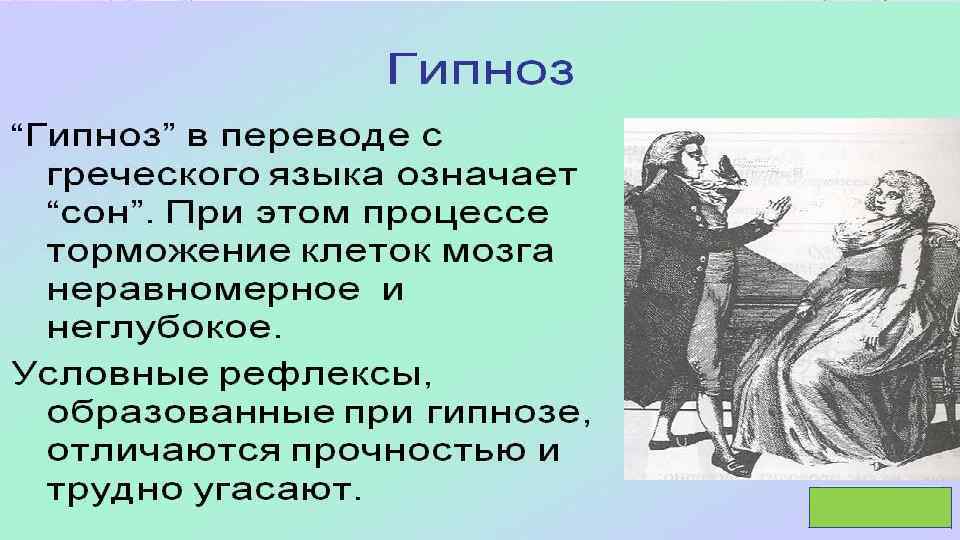 • ГИПНОЗ — ЭТО ОСОБОЕ СОСТОЯНИЕ, ИСКУССТВЕННО ВЫЗВАННЫЙ ЧАСТИЧНЫЙ СОН, А ТОЧНЕЕ ПРЕБЫВАНИЕ МЕЖДУ БОДРСТВОВАНИЕМ И СНОМ. С ТОЧКИ ЗРЕНИЯ ОФИЦИАЛЬНОЙ МЕДИЦИНЫ — ЭТО РЕЗЕРВНАЯ ФОРМА СОСТОЯНИЯ ПСИХИКИ, КОГДА ПОТЕНЦИАЛЬНАЯ ГОТОВНОСТЬ ЕЕ К ПОЛНОЙ МОБИЛИЗАЦИИ НАХОДИТСЯ НА САМОМ ВЫСОКОМ УРОВНЕ. В ЭТО ВРЕМЯ ОБОСТРЯЮТСЯ ВСЕ ЧУВСТВА ЧЕЛОВЕКА, ПОВЫШАЕТСЯ ВОСПРИЯТИЕ, СОЗНАНИЕ СТАНОВИТСЯ ДОСТУПНЫМ ДЛЯ ПОЛУЧЕНИЯ САМОЙ РАЗЛИЧНОЙ ИНФОРМАЦИИ, А СПОСОБНОСТЬ ЕЕ ОБРАБАТЫВАТЬ УСИЛИВАЕТСЯ. НА ЭТОМ И ОСНОВЫВАЕТСЯ ГИПНОТЕРАПИЯ. • ЦЕЛЬЮ ГИПНОТЕРАПИИ ЯВЛЯЕТСЯ ИСПОЛЬЗОВАНИЕ СКРЫТЫХ ВОЗМОЖНОСТЕЙ ПСИХИКИ ЧЕЛОВЕКА ДЛЯ БЫСТРОГО И БЕЗБОЛЕЗНЕННОГО ПРЕОДОЛЕНИЯ КАКИХЛИБО СИМПТОМОВ ИЛИ ПРОБЛЕМ.