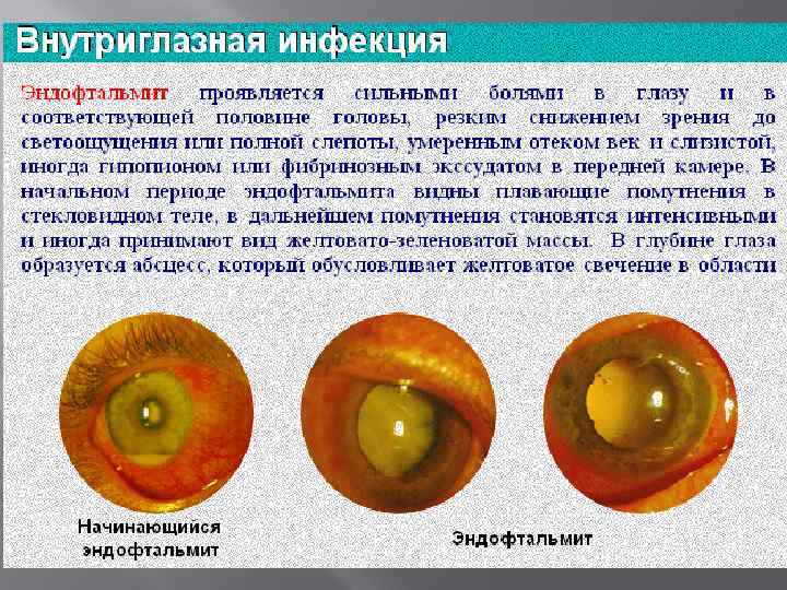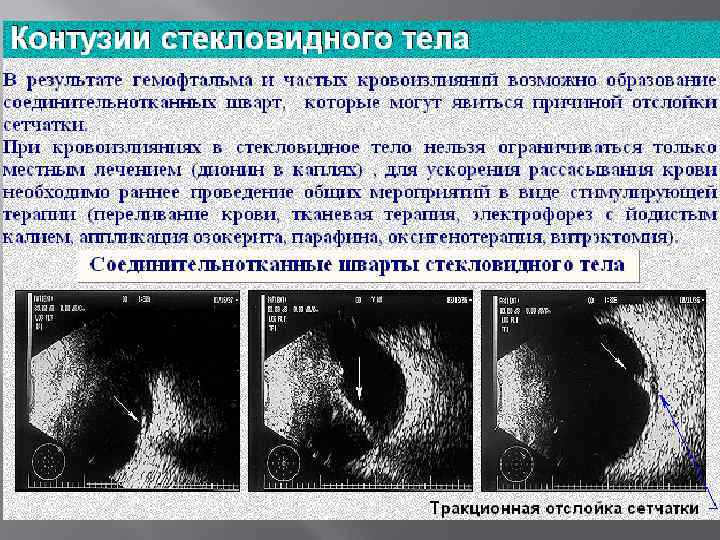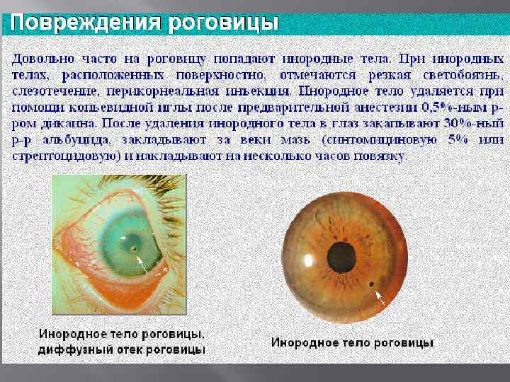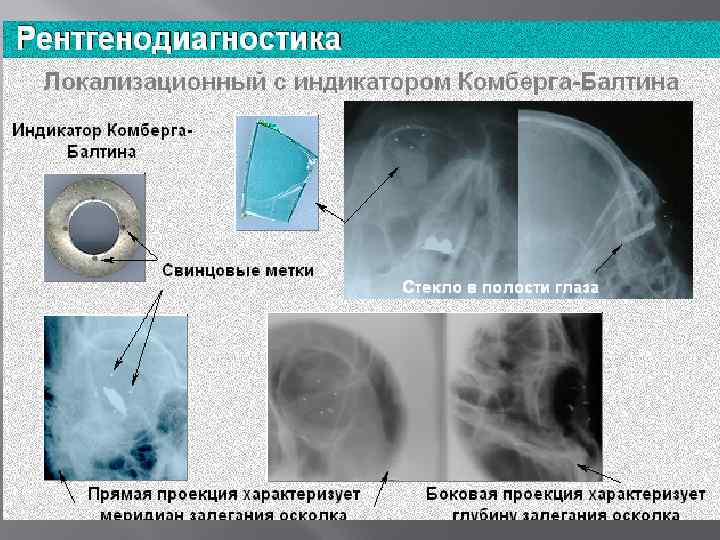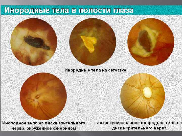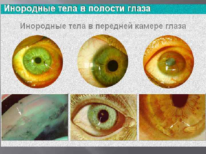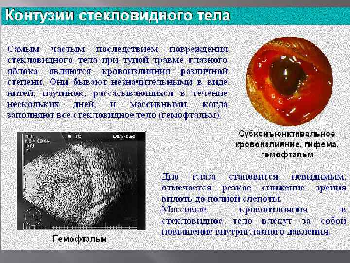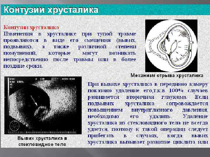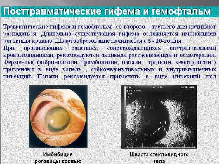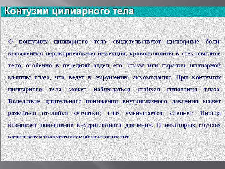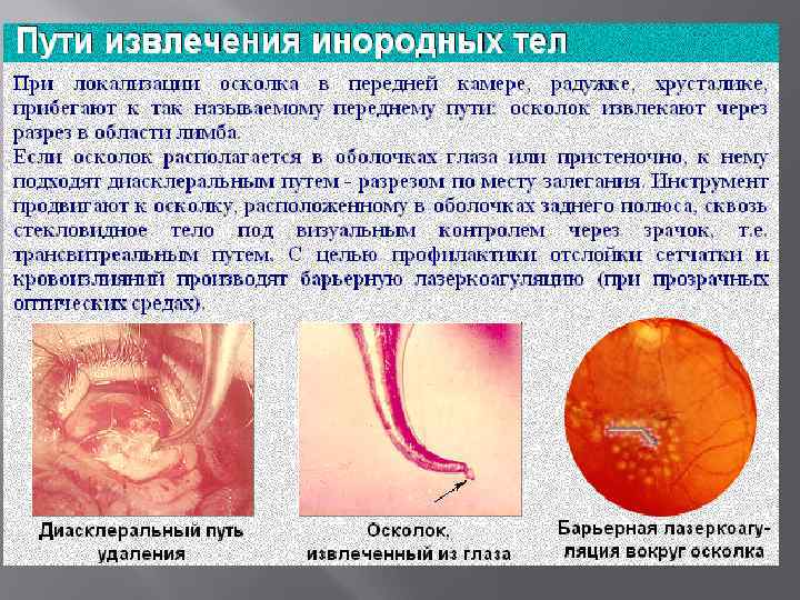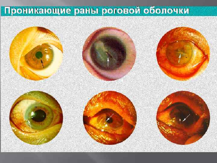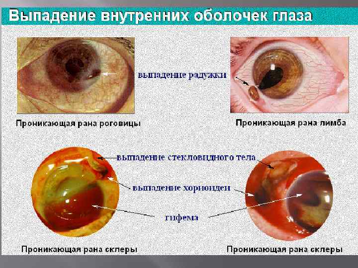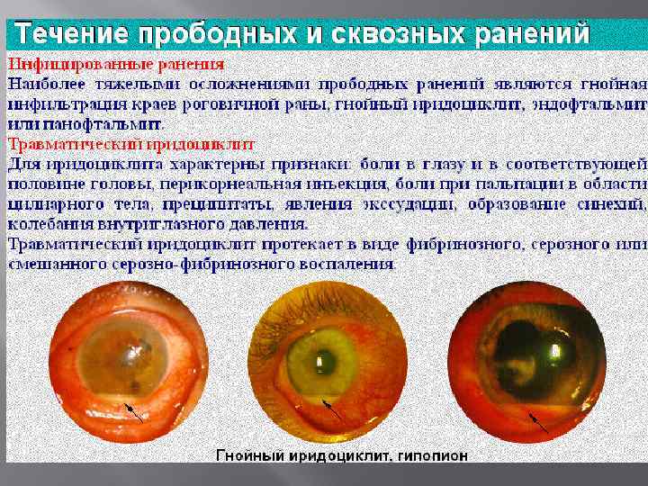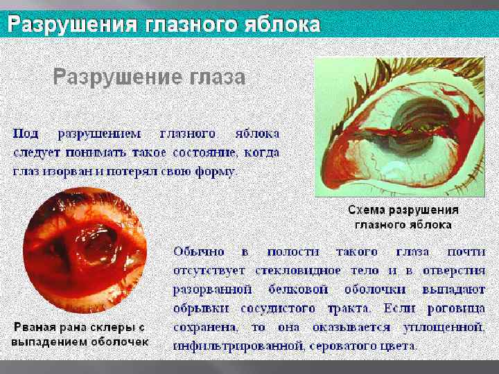 Проникающие ранения глазного яблока: Абсолютные признаки: -рана фиброзной оболочки; Выпадение оболочек в рану; Выпадение стекловидного тела; Пузырек воздуха в стекловидном теле; Наличие раневого канала в хрусталике; Инородное тело внутри глаза; Травматическая колобома радужки. Относительные признаки: неравномерная, мелкая, глубокая передняя камера; Кровоизлияния в полости глаза или в оболочки; Сегментарное помутнение хрусталика; Выраженная гипотония глаза.