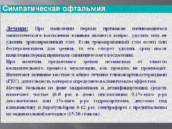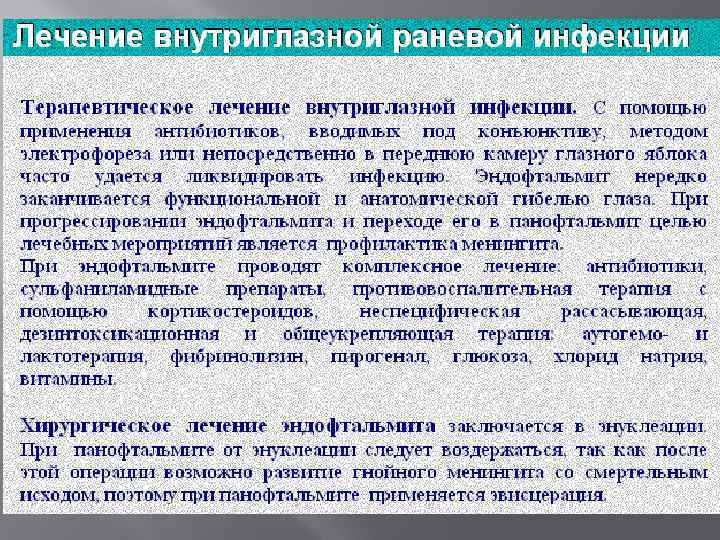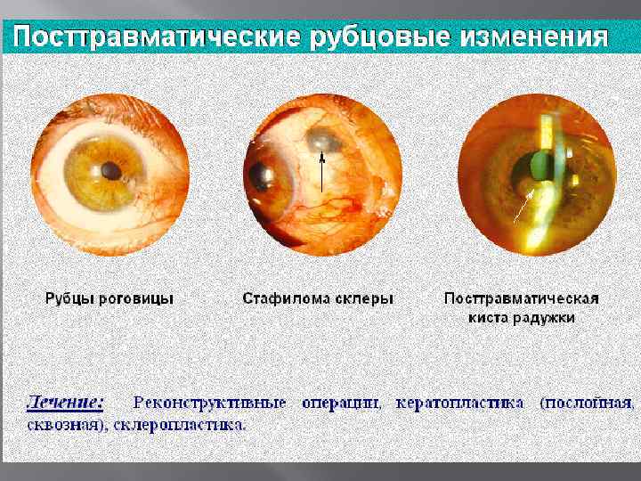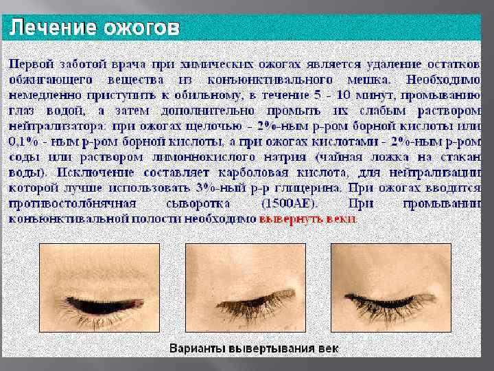 Лечение ожогов: I стадия: Промывание конъюнктивальной полости, а/б, противовоспалительные препараты, мидриатики, кератопротекторы, экстренная хирургия; II стадия: +иммуномодуляторы, антигипоксанты, метаболические препараты. III стадия: при необходимости гипотензивные препараты. IV стадия: глюкокортикостероиды, восстановительная хирургия.