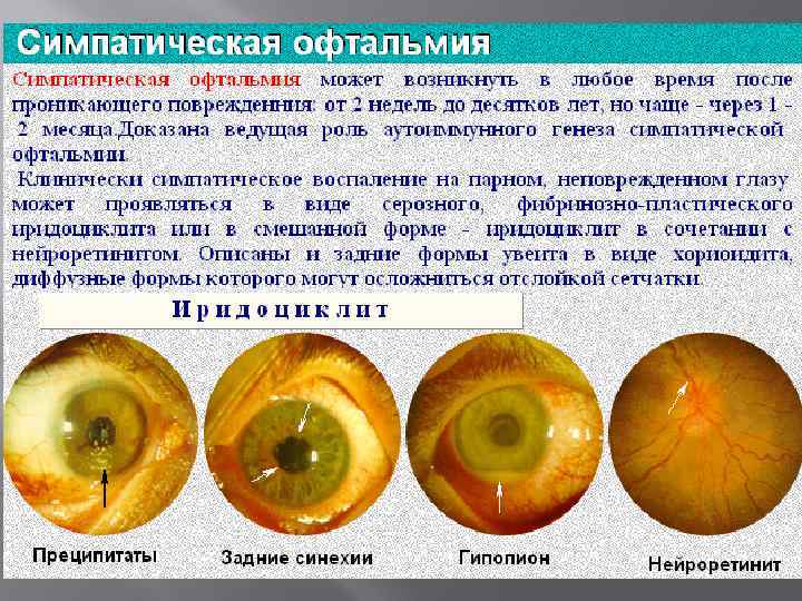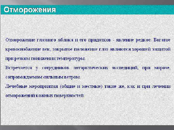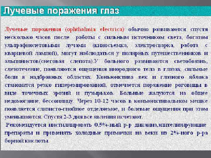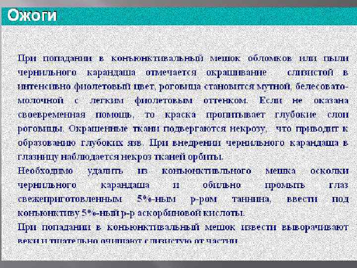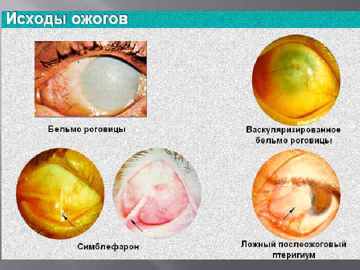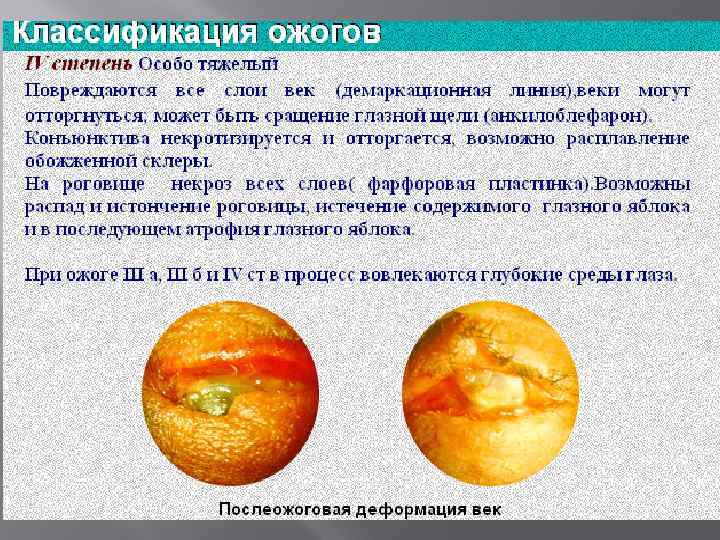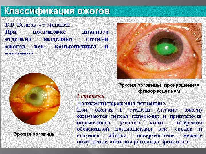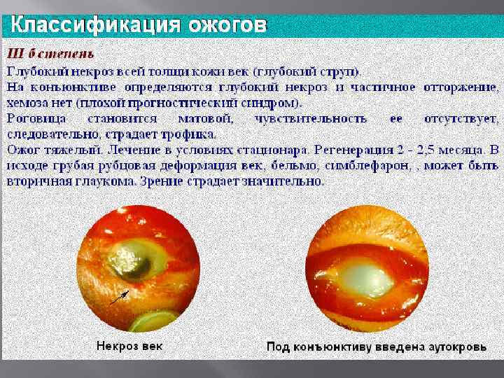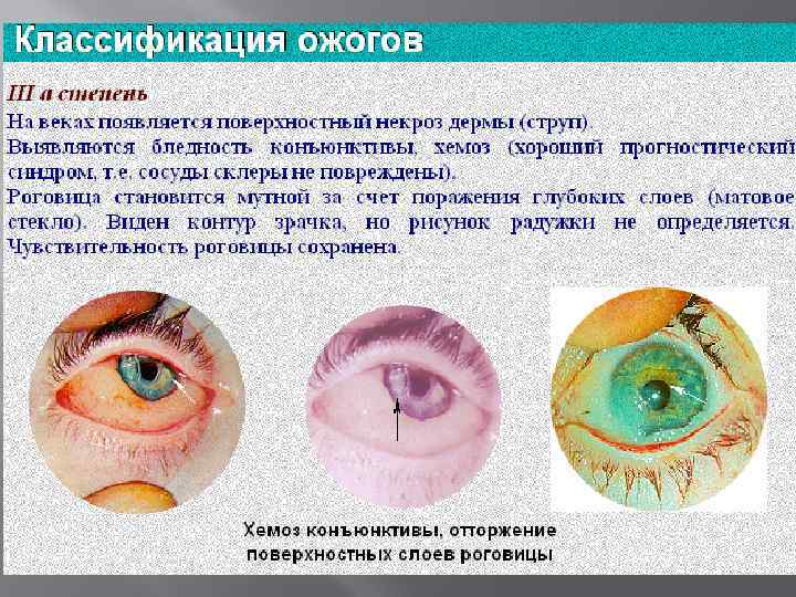 Ожоги глаз: - Классификация: химический, термохимический, лучевой. Общие особенности: прогрессирование и после удаления повреждающего агента, склонность к рецидивам увеитов, тенденция к образованию синехий, спаек, патологической обширной васкуляризации. Стадии ожоговой болезни: I стадия: до 2 суток, некроз поврежденных тканей, отек II стадия: от 2 до 18 суток, выраженные трофические расстройства III стадия: до 2 -3 месяцев, выраженная васкуляризация вседствии гипоксии тканей IV стадия: до нескольких лет, рубцевание с повышенным образованием коллагеновых белков.
