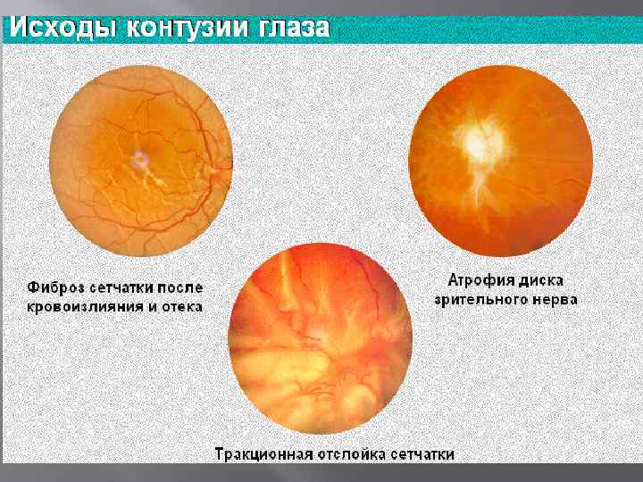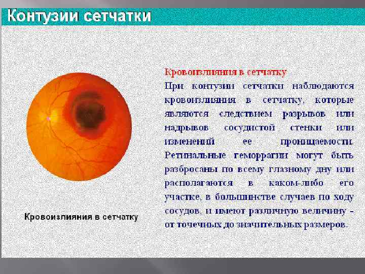 Контузии глазного яблока: - - - По механизму удара: прямая; Непрямая (повреждающий агент не касается глаза). По степени тяжести: легкая: подкожные и/или с/к кровоизлияния, рваноушибленные раны кожи, кольцо Фоссиуса, эрозия роговицы. Средняя: повреждение или отек роговицы, надрыв в поверхностных/глубоких слоях оболочек глаза, гифема, парез внутриглазных мышц, отек сетчатки( Берлиновское помутнение) Тяжелая: снижение остроты зрения на 50%, обширное повреждение век, гематокорнеа, разрыв фиброзной оболочки глаза, повреждения хрусталика, гемофтальм, кровоизлияния во внутренние оболочки глаза, повреждения ЗН, переломы костных стенок орбиты. Особо тяжелая степень: полная утрата зрения, разможжение глазного яблока, отрыв ЗН.