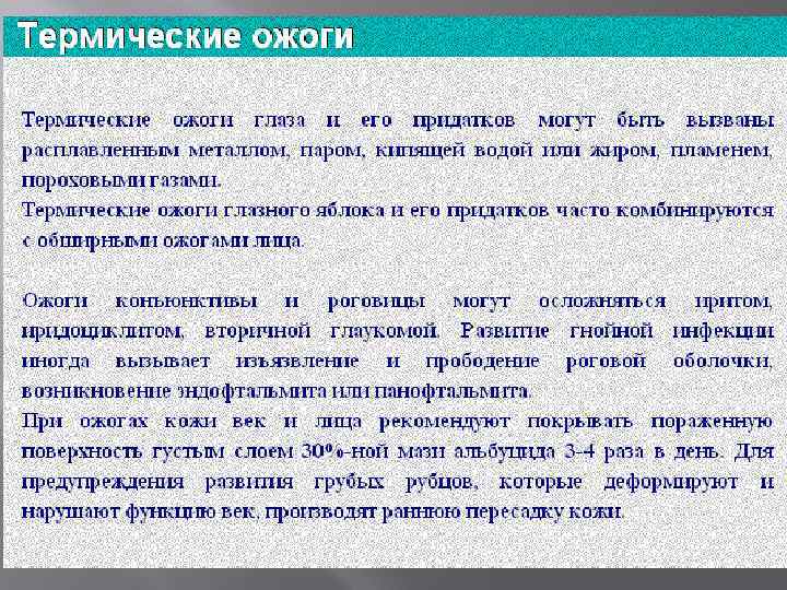Классификация глазной травмы: - По характеру повреждения: Открытые ранения; Закрытые травмы; Термические ожоги; Химические ожоги; Прочие.
