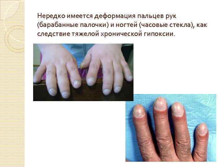 Нередко имеется деформация пальцев рук (барабанные палочки) и ногтей (часовые стекла), как следствие тяжелой хронической гипоксии.
