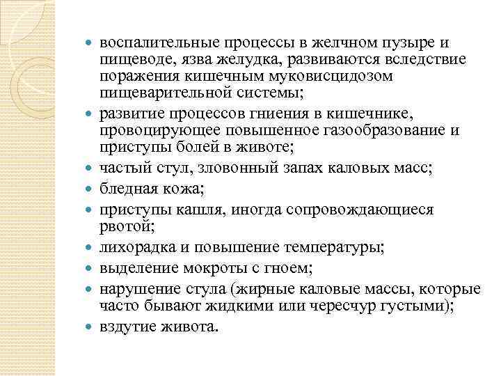 воспалительные процессы в желчном пузыре и пищеводе, язва желудка, развиваются вследствие поражения кишечным муковисцидозом пищеварительной системы; развитие процессов гниения в кишечнике, провоцирующее повышенное газообразование и приступы болей в животе; частый стул, зловонный запах каловых масс; бледная кожа; приступы кашля, иногда сопровождающиеся рвотой; лихорадка и повышение температуры; выделение мокроты с гноем; нарушение стула (жирные каловые массы, которые часто бывают жидкими или чересчур густыми); вздутие живота.
