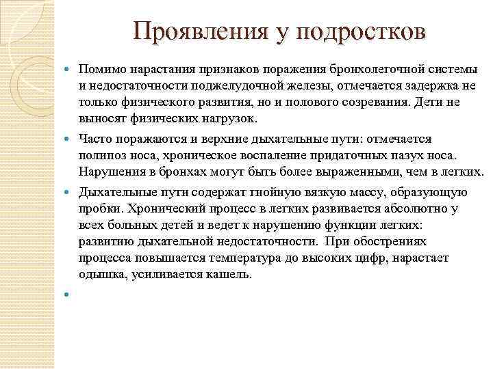 Проявления у подростков Помимо нарастания признаков поражения бронхолегочной системы и недостаточности поджелудочной железы, отмечается задержка не только физического развития, но и полового созревания. Дети не выносят физических нагрузок. Часто поражаются и верхние дыхательные пути: отмечается полипоз носа, хроническое воспаление придаточных пазух носа. Нарушения в бронхах могут быть более выраженными, чем в легких. Дыхательные пути содержат гнойную вязкую массу, образующую пробки. Хронический процесс в легких развивается абсолютно у всех больных детей и ведет к нарушению функции легких: развитию дыхательной недостаточности. При обострениях процесса повышается температура до высоких цифр, нарастает одышка, усиливается кашель.