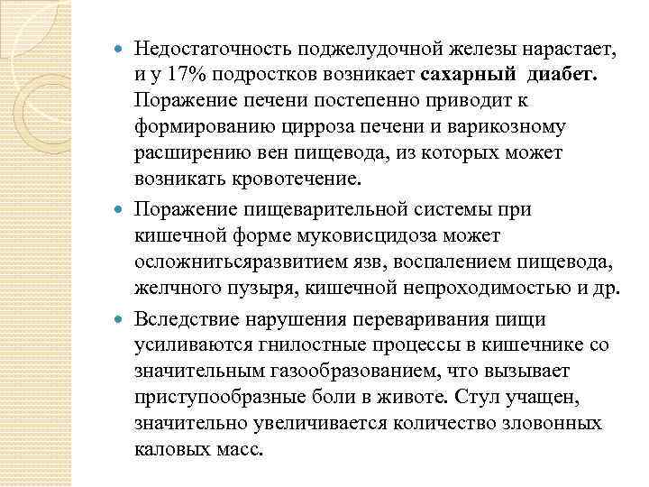 Недостаточность поджелудочной железы нарастает, и у 17% подростков возникает cахарный диабет. Поражение печени постепенно приводит к формированию цирроза печени и варикозному расширению вен пищевода, из которых может возникать кровотечение. Поражение пищеварительной системы при кишечной форме муковисцидоза может осложнитьсяразвитием язв, воспалением пищевода, желчного пузыря, кишечной непроходимостью и др. Вследствие нарушения переваривания пищи усиливаются гнилостные процессы в кишечнике со значительным газообразованием, что вызывает приступообразные боли в животе. Стул учащен, значительно увеличивается количество зловонных каловых масс.