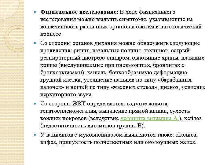 Физикальное исследование: В ходе физикального исследования можно выявить симптомы, указывающие на вовлеченность различных органов и систем в патологический процесс. Со стороны органов дыхания можно обнаружить следующие проявления: ринит, назальные полипы, тахипноэ, острый респираторный дистресс-синдром, свистящие хрипы, влажные хрипы (выслушиваемые при пневмонитах, бронхитах с бронхоэктазами), кашель, бочкообразнаую деформацию грудной клетки, утолщение пальцев по типу «барабанных палочек» и ногтей по типу «часовых стекол» , цианоз, усиление перкуторного звука. Со стороны ЖКТ определяются: вздутие живота, гепатоспленомегалия, выпадение прямой кишки, сухость кожных покровов (вследствие дефицита витамина А ), хейлоз (недостаточность витаминов группы В). У пациентов с муковисцидозом выявляются также: сколиоз, кифоз, припухлость подчелюстных или околоушных желез.