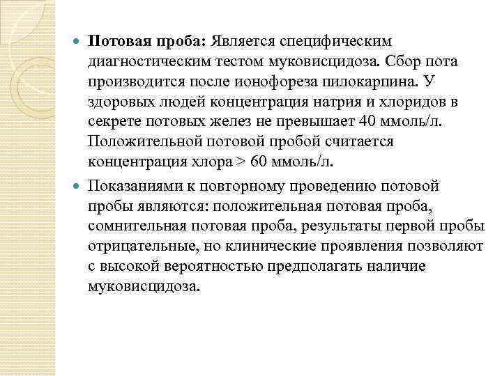 Потовая проба: Является специфическим диагностическим тестом муковисцидоза. Сбор пота производится после ионофореза пилокарпина. У здоровых людей концентрация натрия и хлоридов в секрете потовых желез не превышает 40 ммоль/л. Положительной потовой пробой считается концентрация хлора > 60 ммоль/л. Показаниями к повторному проведению потовой пробы являются: положительная потовая проба, сомнительная потовая проба, результаты первой пробы отрицательные, но клинические проявления позволяют с высокой вероятностью предполагать наличие муковисцидоза.