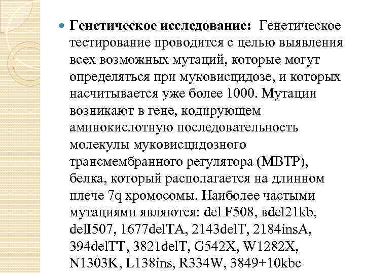 Генетическое исследование: Генетическое тестирование проводится с целью выявления всех возможных мутаций, которые могут определяться при муковисцидозе, и которых насчитывается уже более 1000. Мутации возникают в гене, кодирующем аминокислотную последовательность молекулы муковисцидозного трансмембранного регулятора (МВТР), белка, который располагается на длинном плече 7 q хромосомы. Наиболее частыми мутациями являются: del F 508, вdel 21 kb, del. I 507, 1677 del. TA, 2143 del. T, 2184 ins. A, 394 del. TT, 3821 del. T, G 542 X, W 1282 X, N 1303 K, L 138 ins, R 334 W, 3849+10 kbc