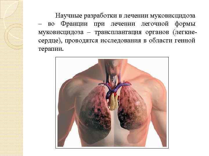 Научные разработки в лечении муковисцидоза – во Франции при лечении легочной формы муковисцидоза – трансплантация органов (легкиесердце), проводятся исследования в области генной терапии.