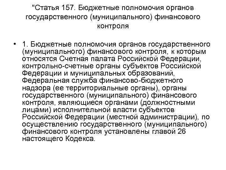 "Статья 157. Бюджетные полномочия органов государственного (муниципального) финансового контроля • 1. Бюджетные полномочия органов государственного (муниципального) финансового контроля, к которым относятся Счетная палата Российской Федерации, контрольно-счетные органы субъектов Российской Федерации и муниципальных образований, Федеральная служба финансово-бюджетного надзора (ее территориальные органы), органы государственного (муниципального) финансового контроля, являющиеся органами (должностными лицами) исполнительной власти субъектов Российской Федерации (местной администрации), по осуществлению государственного (муниципального) финансового контроля установлены главой 26 настоящего Кодекса.
