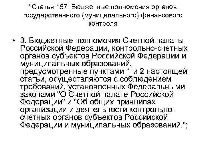 "Статья 157. Бюджетные полномочия органов государственного (муниципального) финансового контроля • 3. Бюджетные полномочия Счетной палаты Российской Федерации, контрольно-счетных органов субъектов Российской Федерации и муниципальных образований, предусмотренные пунктами 1 и 2 настоящей статьи, осуществляются с соблюдением требований, установленных Федеральными законами "О Счетной палате Российской Федерации" и "Об общих принципах организации и деятельности контрольносчетных органов субъектов Российской Федерации и муниципальных образований. ";