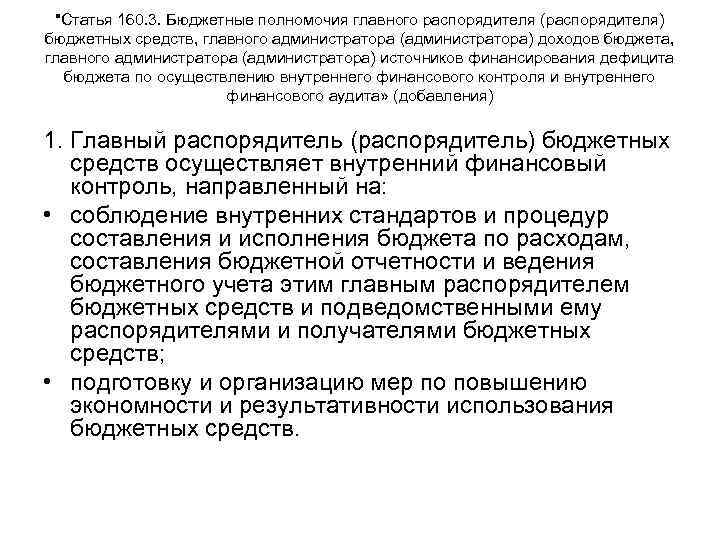 "Статья 160. 3. Бюджетные полномочия главного распорядителя (распорядителя) бюджетных средств, главного администратора (администратора) доходов бюджета, главного администратора (администратора) источников финансирования дефицита бюджета по осуществлению внутреннего финансового контроля и внутреннего финансового аудита» (добавления) 1. Главный распорядитель (распорядитель) бюджетных средств осуществляет внутренний финансовый контроль, направленный на: • соблюдение внутренних стандартов и процедур составления и исполнения бюджета по расходам, составления бюджетной отчетности и ведения бюджетного учета этим главным распорядителем бюджетных средств и подведомственными ему распорядителями и получателями бюджетных средств; • подготовку и организацию мер по повышению экономности и результативности использования бюджетных средств.