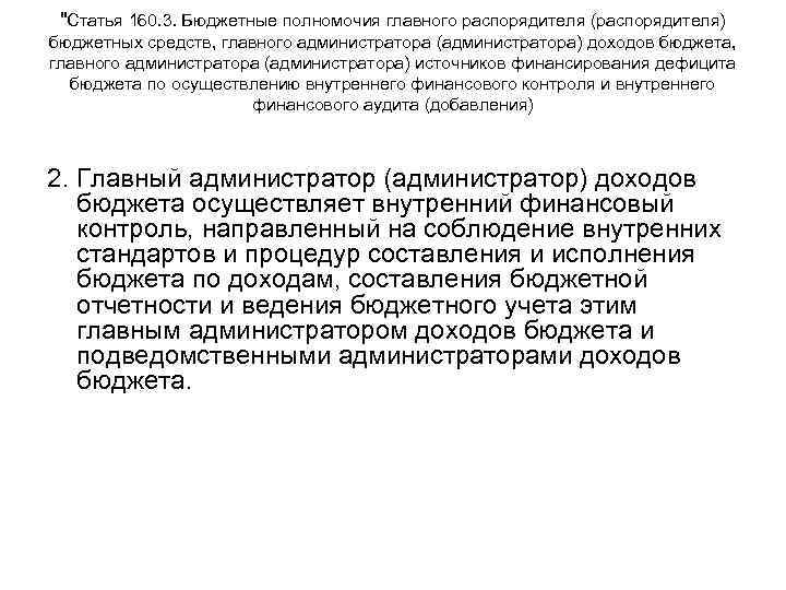 "Статья 160. 3. Бюджетные полномочия главного распорядителя (распорядителя) бюджетных средств, главного администратора (администратора) доходов бюджета, главного администратора (администратора) источников финансирования дефицита бюджета по осуществлению внутреннего финансового контроля и внутреннего финансового аудита (добавления) 2. Главный администратор (администратор) доходов бюджета осуществляет внутренний финансовый контроль, направленный на соблюдение внутренних стандартов и процедур составления и исполнения бюджета по доходам, составления бюджетной отчетности и ведения бюджетного учета этим главным администратором доходов бюджета и подведомственными администраторами доходов бюджета.