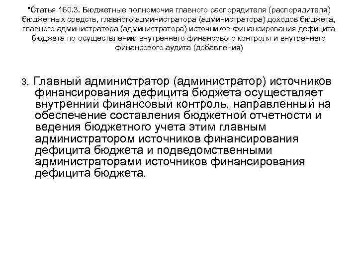 "Статья 160. 3. Бюджетные полномочия главного распорядителя (распорядителя) бюджетных средств, главного администратора (администратора) доходов бюджета, главного администратора (администратора) источников финансирования дефицита бюджета по осуществлению внутреннего финансового контроля и внутреннего финансового аудита (добавления) 3. Главный администратор (администратор) источников финансирования дефицита бюджета осуществляет внутренний финансовый контроль, направленный на обеспечение составления бюджетной отчетности и ведения бюджетного учета этим главным администратором источников финансирования дефицита бюджета и подведомственными администраторами источников финансирования дефицита бюджета.