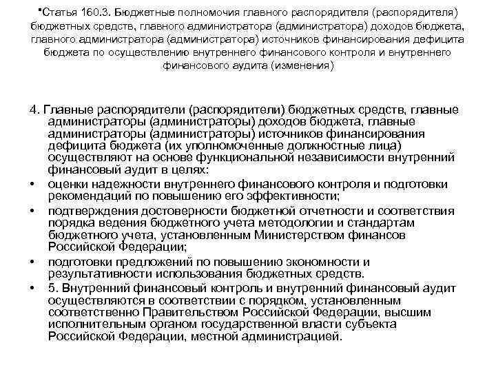 "Статья 160. 3. Бюджетные полномочия главного распорядителя (распорядителя) бюджетных средств, главного администратора (администратора) доходов бюджета, главного администратора (администратора) источников финансирования дефицита бюджета по осуществлению внутреннего финансового контроля и внутреннего финансового аудита (изменения) 4. Главные распорядители (распорядители) бюджетных средств, главные администраторы (администраторы) доходов бюджета, главные администраторы (администраторы) источников финансирования дефицита бюджета (их уполномоченные должностные лица) осуществляют на основе функциональной независимости внутренний финансовый аудит в целях: • оценки надежности внутреннего финансового контроля и подготовки рекомендаций по повышению его эффективности; • подтверждения достоверности бюджетной отчетности и соответствия порядка ведения бюджетного учета методологии и стандартам бюджетного учета, установленным Министерством финансов Российской Федерации; • подготовки предложений по повышению экономности и результативности использования бюджетных средств. • 5. Внутренний финансовый контроль и внутренний финансовый аудит осуществляются в соответствии с порядком, установленным соответственно Правительством Российской Федерации, высшим исполнительным органом государственной власти субъекта Российской Федерации, местной администрацией.