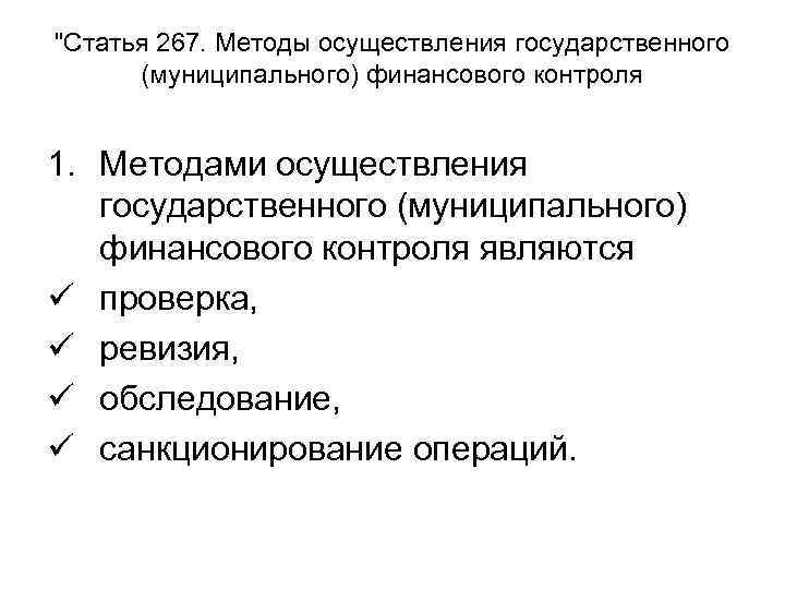 "Статья 267. Методы осуществления государственного (муниципального) финансового контроля 1. Методами осуществления государственного (муниципального) финансового контроля являются ü проверка, ü ревизия, ü обследование, ü санкционирование операций.