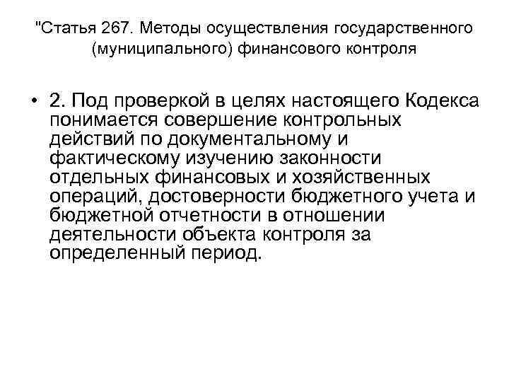 "Статья 267. Методы осуществления государственного (муниципального) финансового контроля • 2. Под проверкой в целях настоящего Кодекса понимается совершение контрольных действий по документальному и фактическому изучению законности отдельных финансовых и хозяйственных операций, достоверности бюджетного учета и бюджетной отчетности в отношении деятельности объекта контроля за определенный период.