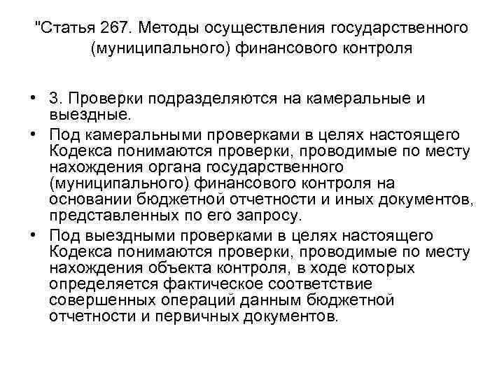"Статья 267. Методы осуществления государственного (муниципального) финансового контроля • 3. Проверки подразделяются на камеральные и выездные. • Под камеральными проверками в целях настоящего Кодекса понимаются проверки, проводимые по месту нахождения органа государственного (муниципального) финансового контроля на основании бюджетной отчетности и иных документов, представленных по его запросу. • Под выездными проверками в целях настоящего Кодекса понимаются проверки, проводимые по месту нахождения объекта контроля, в ходе которых определяется фактическое соответствие совершенных операций данным бюджетной отчетности и первичных документов.