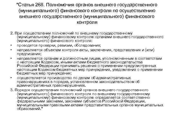 "Статья 268. Полномочия органов внешнего государственного (муниципального) финансового контроля по осуществлению внешнего государственного (муниципального) финансового контроля 2. При осуществлении полномочий по внешнему государственному (муниципальному) финансовому контролю органами внешнего государственного (муниципального) финансового контроля: • проводятся проверки, ревизии, обследования; • направляются объектам контроля акты, заключения, представления и (или) предписания; • направляются органам и должностным лицам, уполномоченным в соответствии с настоящим Кодексом, иными актами бюджетного законодательства Российской Федерации принимать решения о применении предусмотренных настоящим Кодексом бюджетных мер принуждения, уведомления о применении бюджетных мер принуждения; • осуществляется производство по делам об административных правонарушениях в порядке, установленном законодательством об административных правонарушениях. 3. Порядок осуществления полномочий органов внешнего государственного (муниципального) финансового контроля по внешнему государственному (муниципальному) финансовому контролю определяется соответственно федеральными законами, законами субъектов Российской Федерации, муниципальными правовыми актами представительных органов муниципальных образований. "
