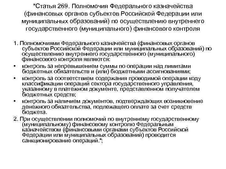 "Статья 269. Полномочия Федерального казначейства (финансовых органов субъектов Российской Федерации или муниципальных образований) по осуществлению внутреннего государственного (муниципального) финансового контроля 1. Полномочиями Федерального казначейства (финансовых органов субъектов Российской Федерации или муниципальных образований) по осуществлению внутреннего государственного (муниципального) финансового контроля являются: • контроль за непревышением суммы по операции над лимитами бюджетных обязательств и (или) бюджетными ассигнованиями; • контроль за соответствием содержания проводимой операции коду классификации операций сектора государственного управления, указанному в платежном документе, представленном получателем бюджетных средств; • контроль за наличием документов, подтверждающих возникновение денежного обязательства, подлежащего оплате за счет средств бюджета. 2. При осуществлении полномочий по внутреннему государственному (муниципальному) финансовому контролю Федеральным казначейством (финансовыми органами субъектов Российской Федерации или муниципальных образований) проводится санкционирование операций. ";