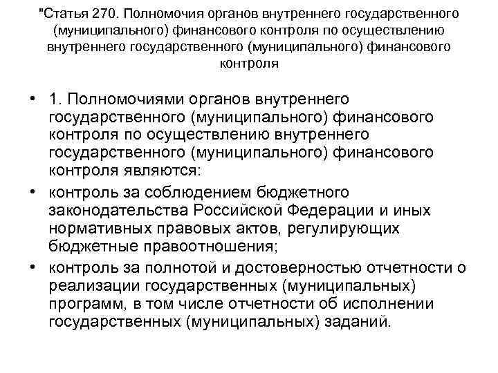 "Статья 270. Полномочия органов внутреннего государственного (муниципального) финансового контроля по осуществлению внутреннего государственного (муниципального) финансового контроля • 1. Полномочиями органов внутреннего государственного (муниципального) финансового контроля по осуществлению внутреннего государственного (муниципального) финансового контроля являются: • контроль за соблюдением бюджетного законодательства Российской Федерации и иных нормативных правовых актов, регулирующих бюджетные правоотношения; • контроль за полнотой и достоверностью отчетности о реализации государственных (муниципальных) программ, в том числе отчетности об исполнении государственных (муниципальных) заданий.