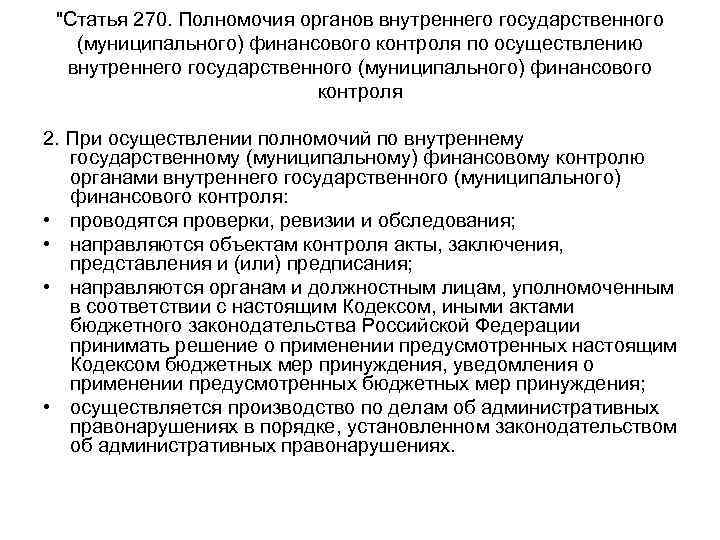 "Статья 270. Полномочия органов внутреннего государственного (муниципального) финансового контроля по осуществлению внутреннего государственного (муниципального) финансового контроля 2. При осуществлении полномочий по внутреннему государственному (муниципальному) финансовому контролю органами внутреннего государственного (муниципального) финансового контроля: • проводятся проверки, ревизии и обследования; • направляются объектам контроля акты, заключения, представления и (или) предписания; • направляются органам и должностным лицам, уполномоченным в соответствии с настоящим Кодексом, иными актами бюджетного законодательства Российской Федерации принимать решение о применении предусмотренных настоящим Кодексом бюджетных мер принуждения, уведомления о применении предусмотренных бюджетных мер принуждения; • осуществляется производство по делам об административных правонарушениях в порядке, установленном законодательством об административных правонарушениях.