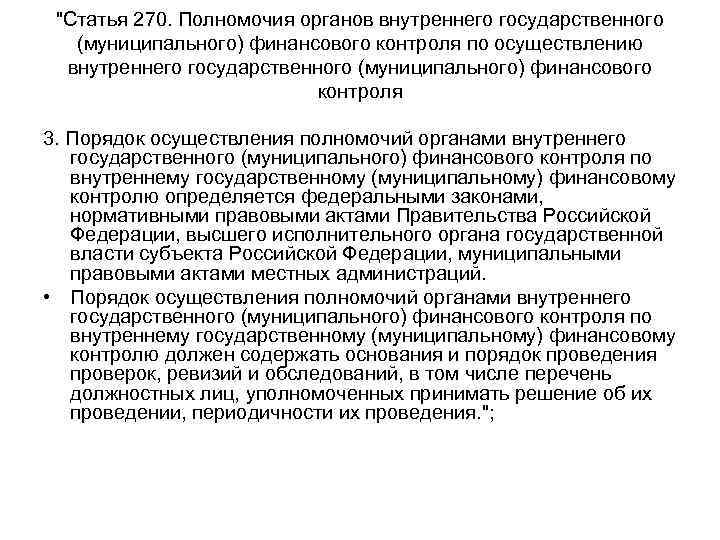 "Статья 270. Полномочия органов внутреннего государственного (муниципального) финансового контроля по осуществлению внутреннего государственного (муниципального) финансового контроля 3. Порядок осуществления полномочий органами внутреннего государственного (муниципального) финансового контроля по внутреннему государственному (муниципальному) финансовому контролю определяется федеральными законами, нормативными правовыми актами Правительства Российской Федерации, высшего исполнительного органа государственной власти субъекта Российской Федерации, муниципальными правовыми актами местных администраций. • Порядок осуществления полномочий органами внутреннего государственного (муниципального) финансового контроля по внутреннему государственному (муниципальному) финансовому контролю должен содержать основания и порядок проведения проверок, ревизий и обследований, в том числе перечень должностных лиц, уполномоченных принимать решение об их проведении, периодичности их проведения. ";
