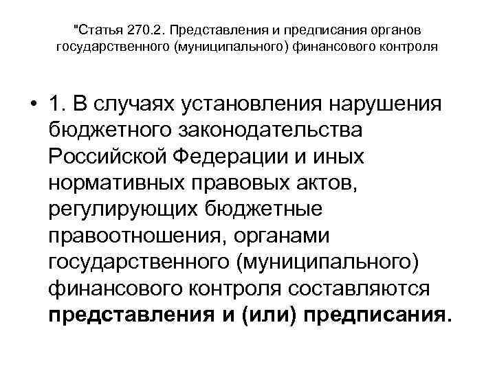 "Статья 270. 2. Представления и предписания органов государственного (муниципального) финансового контроля • 1. В случаях установления нарушения бюджетного законодательства Российской Федерации и иных нормативных правовых актов, регулирующих бюджетные правоотношения, органами государственного (муниципального) финансового контроля составляются представления и (или) предписания.