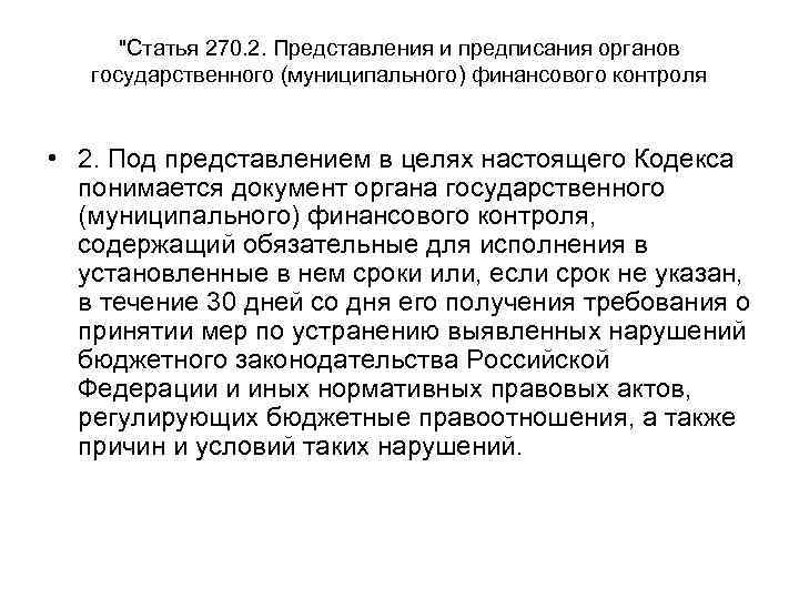 "Статья 270. 2. Представления и предписания органов государственного (муниципального) финансового контроля • 2. Под представлением в целях настоящего Кодекса понимается документ органа государственного (муниципального) финансового контроля, содержащий обязательные для исполнения в установленные в нем сроки или, если срок не указан, в течение 30 дней со дня его получения требования о принятии мер по устранению выявленных нарушений бюджетного законодательства Российской Федерации и иных нормативных правовых актов, регулирующих бюджетные правоотношения, а также причин и условий таких нарушений.