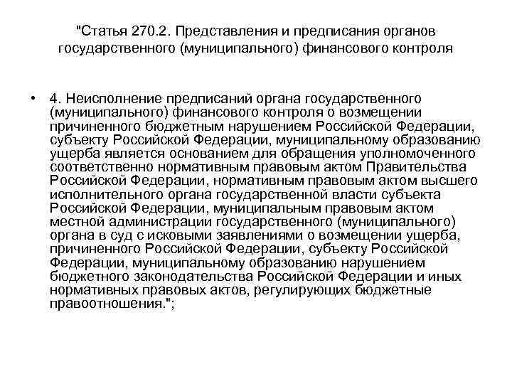"Статья 270. 2. Представления и предписания органов государственного (муниципального) финансового контроля • 4. Неисполнение предписаний органа государственного (муниципального) финансового контроля о возмещении причиненного бюджетным нарушением Российской Федерации, субъекту Российской Федерации, муниципальному образованию ущерба является основанием для обращения уполномоченного соответственно нормативным правовым актом Правительства Российской Федерации, нормативным правовым актом высшего исполнительного органа государственной власти субъекта Российской Федерации, муниципальным правовым актом местной администрации государственного (муниципального) органа в суд с исковыми заявлениями о возмещении ущерба, причиненного Российской Федерации, субъекту Российской Федерации, муниципальному образованию нарушением бюджетного законодательства Российской Федерации и иных нормативных правовых актов, регулирующих бюджетные правоотношения. ";