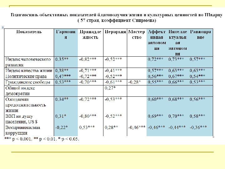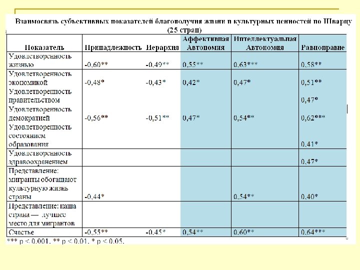 Выводы 1. Опираясь на представления Р. Инглхарта о том, что культуры, вошедшие в постмодернистскую стадию развития, успешно сочетают в себе автономию и гармонию с окружающим миром, мы дополнили ценности Самовыражения по Инглхарту не только ценностями Автономии по Шварцу, но и ценностями Гармонии. Этот параметр позволяет точнее оценить приближенность культуры к ценностям постмодернизма. 2. Сочетание ценностей индивидуальной автономии, самореализации и гармонии с окружающим миром – это черты культуры зрелой, самодостаточной, которая настолько уверена в своих ценностях, что не нуждается в том, чтобы силой утверждать себя в окружающем мире, она стремится к балансу с ним и тем самым становится притягательной для других культур. n Поликультурность стран англоязычного ареала сочетается с их высоким экономическим развитием. Возможно, поликультурность – один из факторов развития. Наличие большого количества различных этнических групп создает внутрикультурный конфликт, который является серьезным вызовом любой стране на определенном этапе ее развития. И если странам удается его преодолеть, остаться открытыми и стоящими на универсалистских позициях, не прибегая к закрытости и культурной (национальной) исключительности, то они становятся более успешными и конкурентоспособными, получая новые импульсы к развитию за счет притока мигрантов. Таким образом, внутрикультурный конфликт – один из вызовов и потенциальных факторов развития.