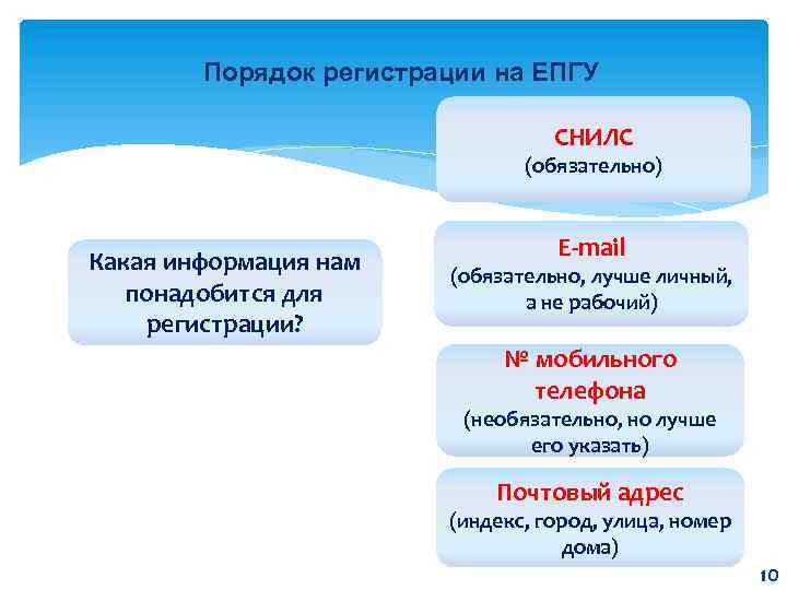 Порядок регистрации на ЕПГУ СНИЛС (обязательно) Какая информация нам понадобится для регистрации? E-mail (обязательно, лучше личный, а не рабочий) № мобильного телефона (необязательно, но лучше его указать) Почтовый адрес (индекс, город, улица, номер дома) 10