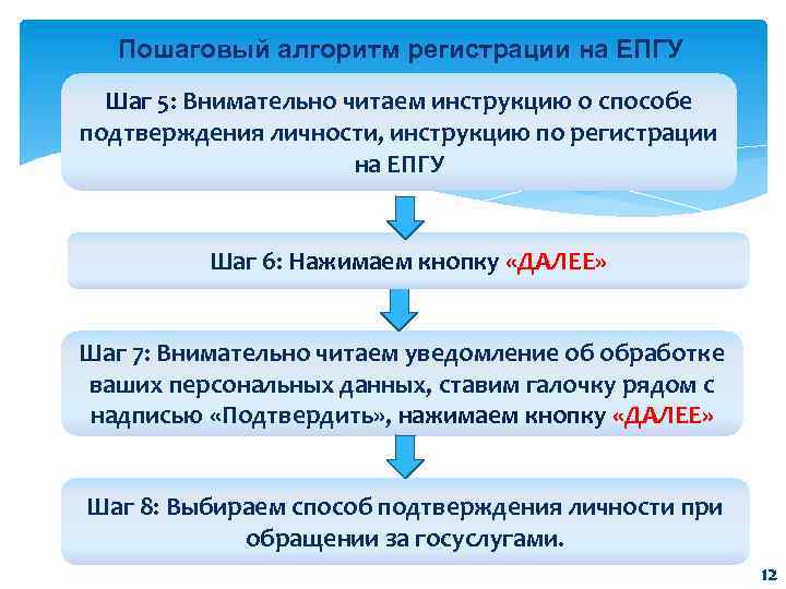 Пошаговый алгоритм регистрации на ЕПГУ Шаг 5: Внимательно читаем инструкцию о способе подтверждения личности, инструкцию по регистрации на ЕПГУ Шаг 6: Нажимаем кнопку «ДАЛЕЕ» Шаг 7: Внимательно читаем уведомление об обработке ваших персональных данных, ставим галочку рядом с надписью «Подтвердить» , нажимаем кнопку «ДАЛЕЕ» Шаг 8: Выбираем способ подтверждения личности при обращении за госуслугами. 12