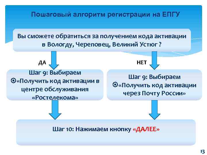 Пошаговый алгоритм регистрации на ЕПГУ Вы сможете обратиться за получением кода активации в Вологду, Череповец, Великий Устюг ? ДА НЕТ Шаг 9: Выбираем «Получить код активации в центре обслуживания «Ростелекома» Шаг 9: Выбираем «Получить код активации через Почту России» Шаг 10: Нажимаем кнопку «ДАЛЕЕ» 13