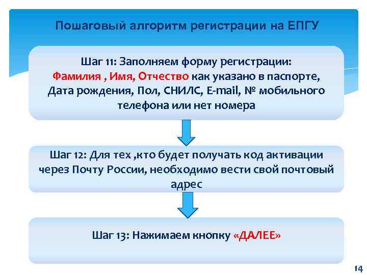 Пошаговый алгоритм регистрации на ЕПГУ Шаг 11: Заполняем форму регистрации: Фамилия , Имя, Отчество как указано в паспорте, Дата рождения, Пол, СНИЛС, E-mail, № мобильного телефона или нет номера Шаг 12: Для тех , кто будет получать код активации через Почту России, необходимо вести свой почтовый адрес Шаг 13: Нажимаем кнопку «ДАЛЕЕ» 14