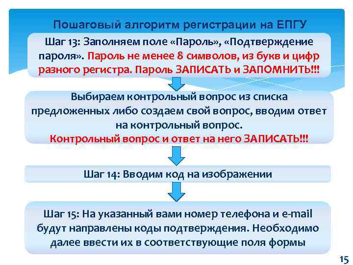 Пошаговый алгоритм регистрации на ЕПГУ Шаг 13: Заполняем поле «Пароль» , «Подтверждение пароля» . Пароль не менее 8 символов, из букв и цифр разного регистра. Пароль ЗАПИСАТЬ и ЗАПОМНИТЬ!!! Выбираем контрольный вопрос из списка предложенных либо создаем свой вопрос, вводим ответ на контрольный вопрос. Контрольный вопрос и ответ на него ЗАПИСАТЬ!!! Шаг 14: Вводим код на изображении Шаг 15: На указанный вами номер телефона и e-mail будут направлены коды подтверждения. Необходимо далее ввести их в соответствующие поля формы 15
