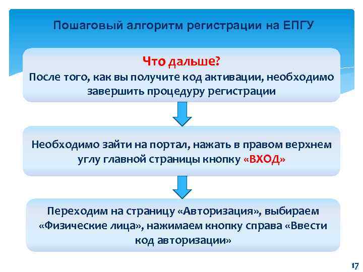 Пошаговый алгоритм регистрации на ЕПГУ Что дальше? После того, как вы получите код активации, необходимо завершить процедуру регистрации Необходимо зайти на портал, нажать в правом верхнем углу главной страницы кнопку «ВХОД» Переходим на страницу «Авторизация» , выбираем «Физические лица» , нажимаем кнопку справа «Ввести код авторизации» 17