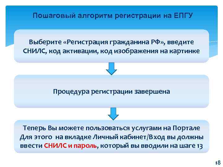 Пошаговый алгоритм регистрации на ЕПГУ Выберите «Регистрация гражданина РФ» , введите СНИЛС, код активации, код изображения на картинке Процедура регистрации завершена Теперь Вы можете пользоваться услугами на Портале Для этого на вкладке Личный кабинет/Вход вы должны ввести СНИЛС и пароль, который вы вводили на шаге 13 18