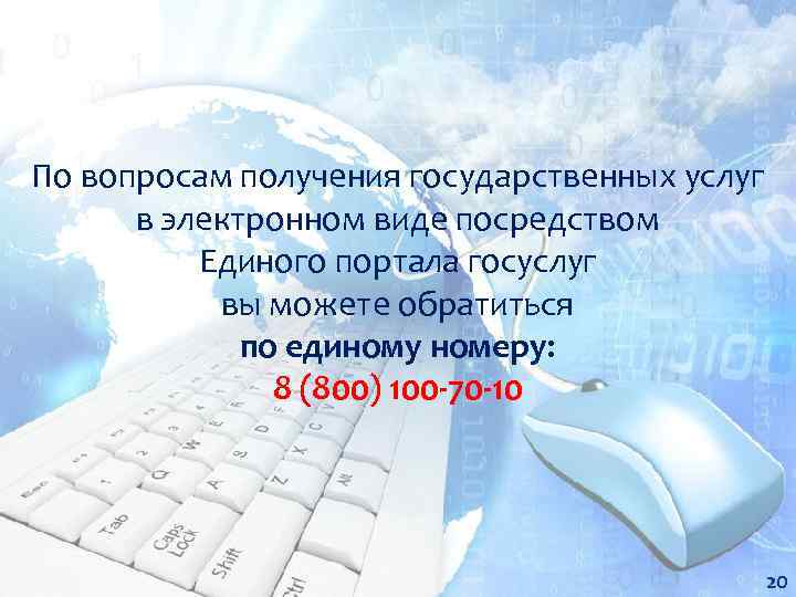 По вопросам получения государственных услуг в электронном виде посредством Единого портала госуслуг вы можете обратиться по единому номеру: 8 (800) 100 -70 -10 20