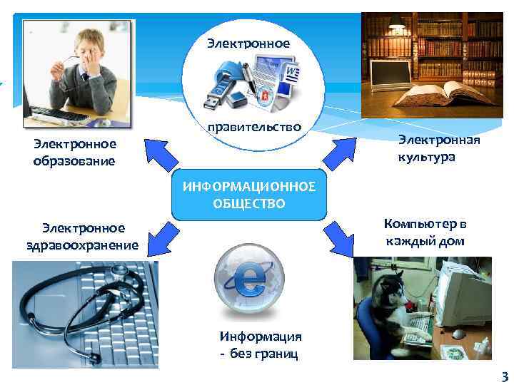 Электронное образование правительство Электронная культура ИНФОРМАЦИОННОЕ ОБЩЕСТВО Компьютер в каждый дом Электронное здравоохранение Информация - без границ 3